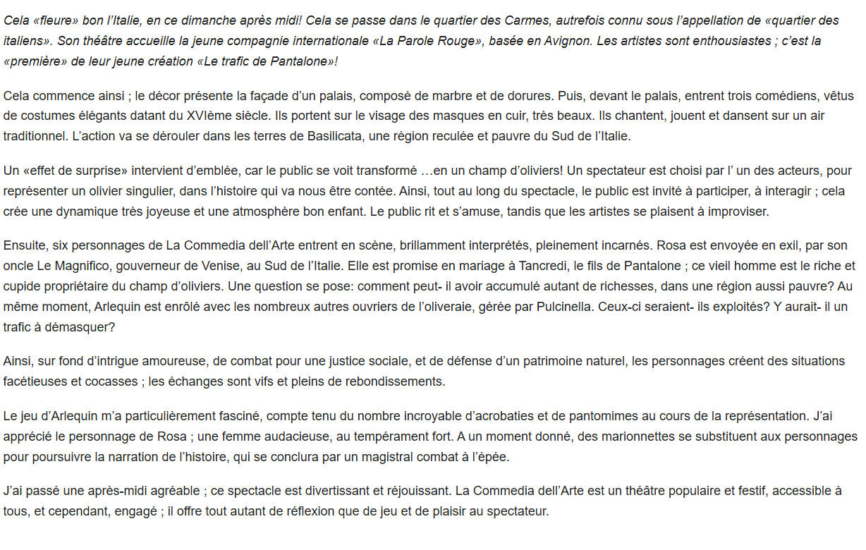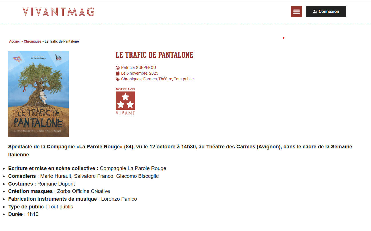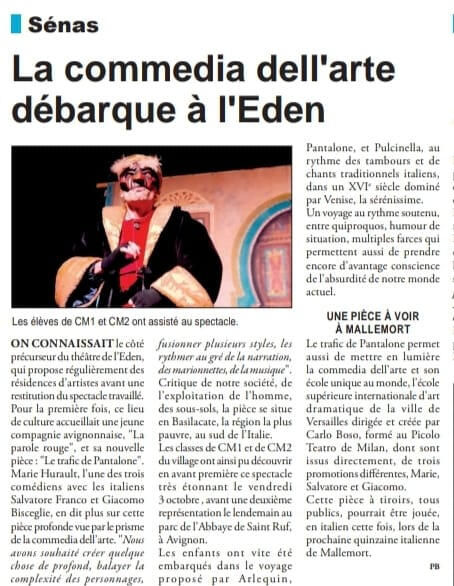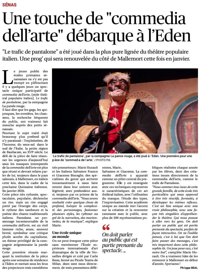 Le Trafic de Pantalone, créé à l’occasion du festival “La semaine italienne” de la ville d’Avignon, est le fruit d’une recherche sociologique et artistique ambitieuse portée par la compagnie La Parole Rouge.