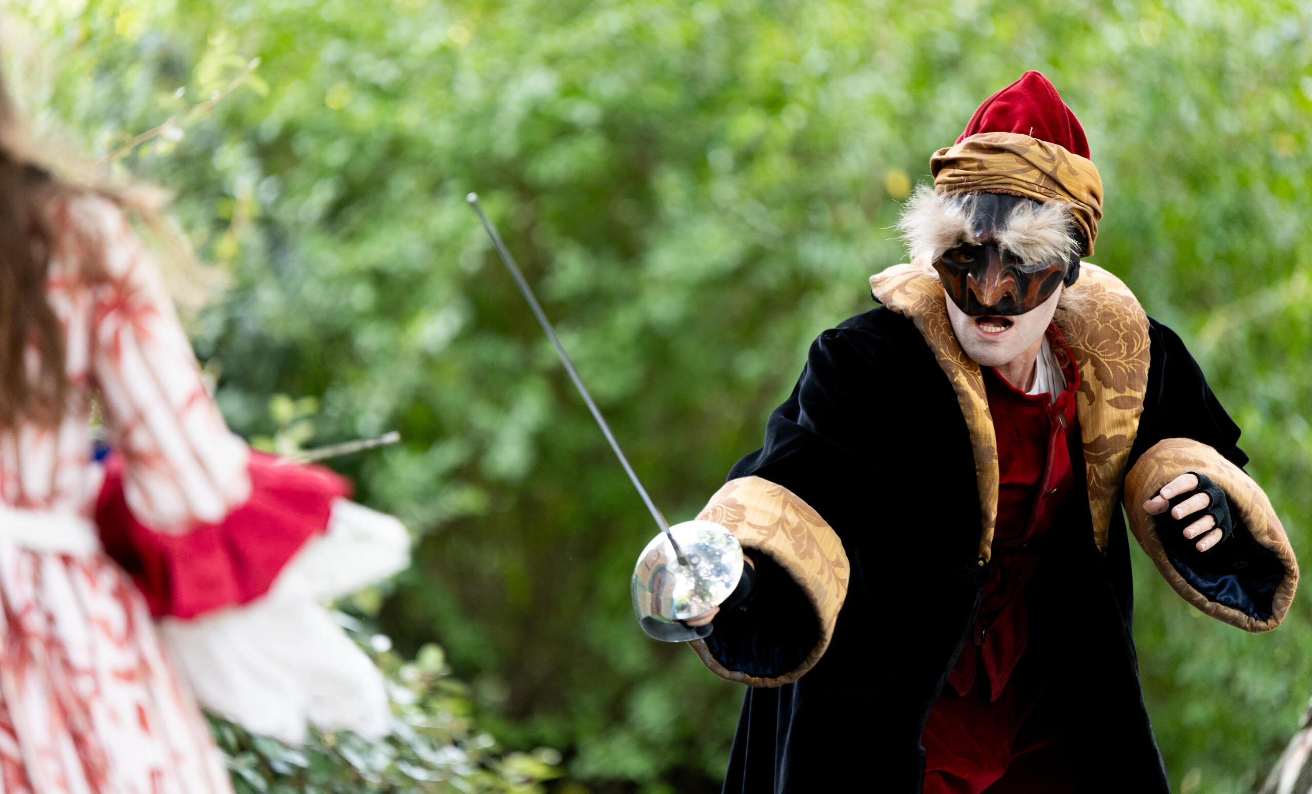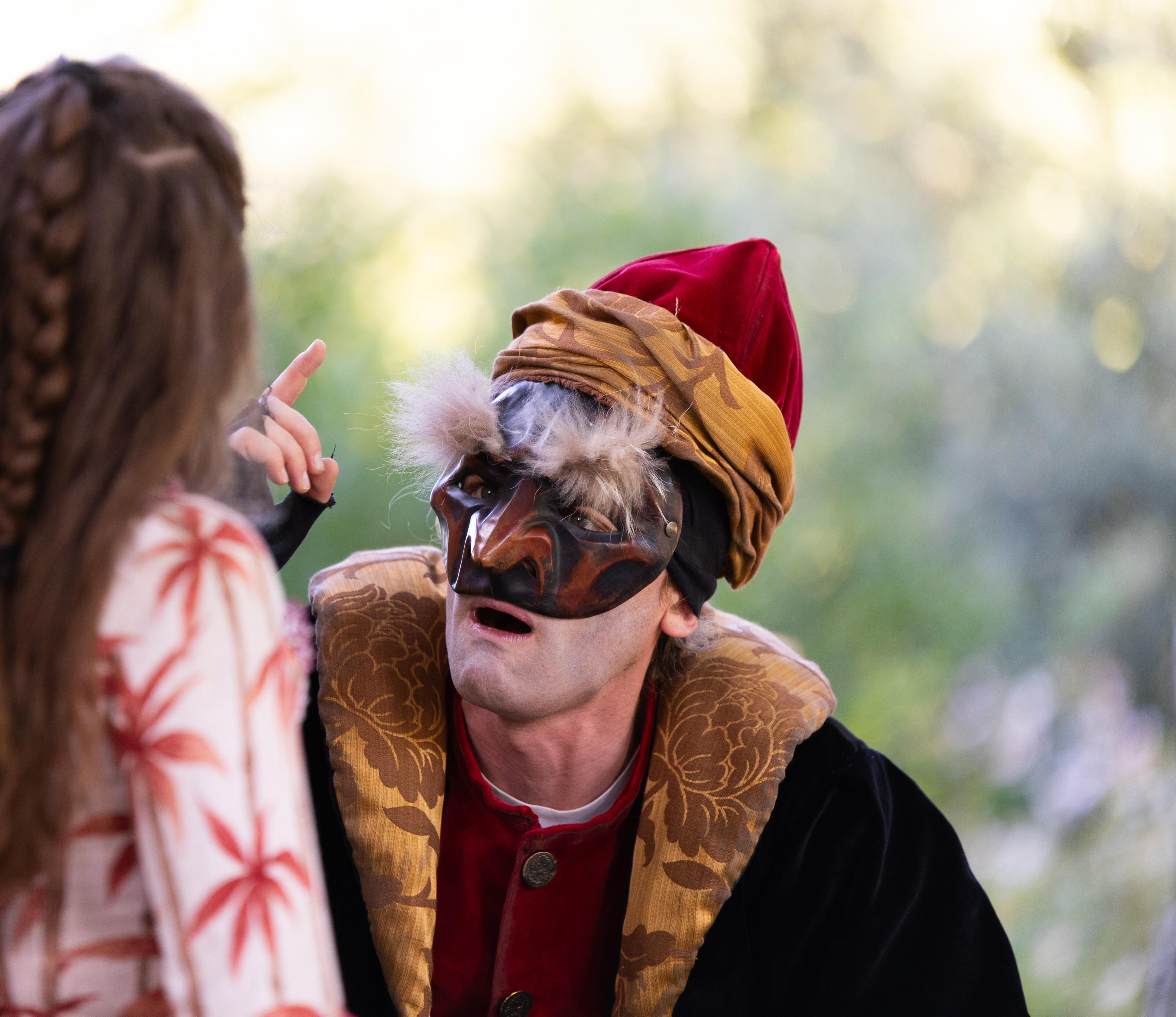 Du point de vue artistique nous avons choisi d’embrasser la tradition de la Commedia dell’Arte avec une création originale de masques en cuir ainsi que des costumes du 16eme siècle. Le spectacle, émaillé de combats à l’épée, est endiablé par des tarantelles et des tammurriate du sud de l’Italie.