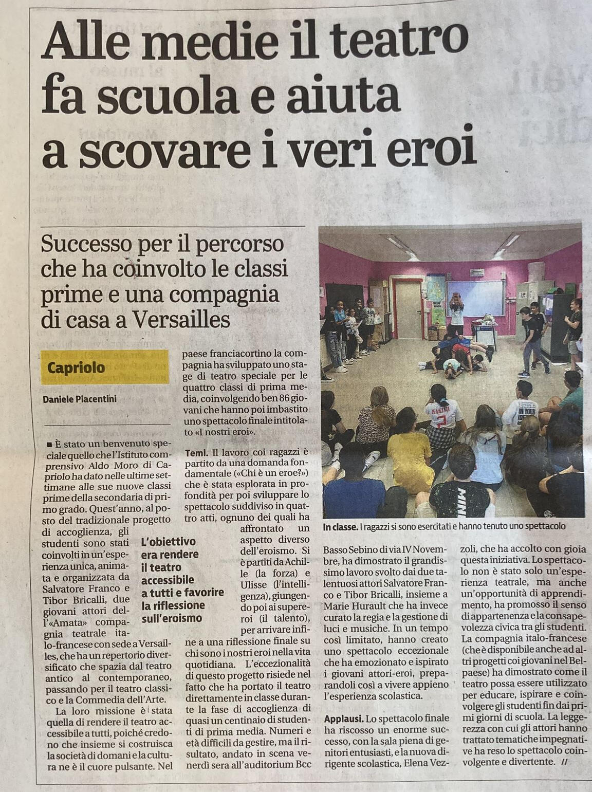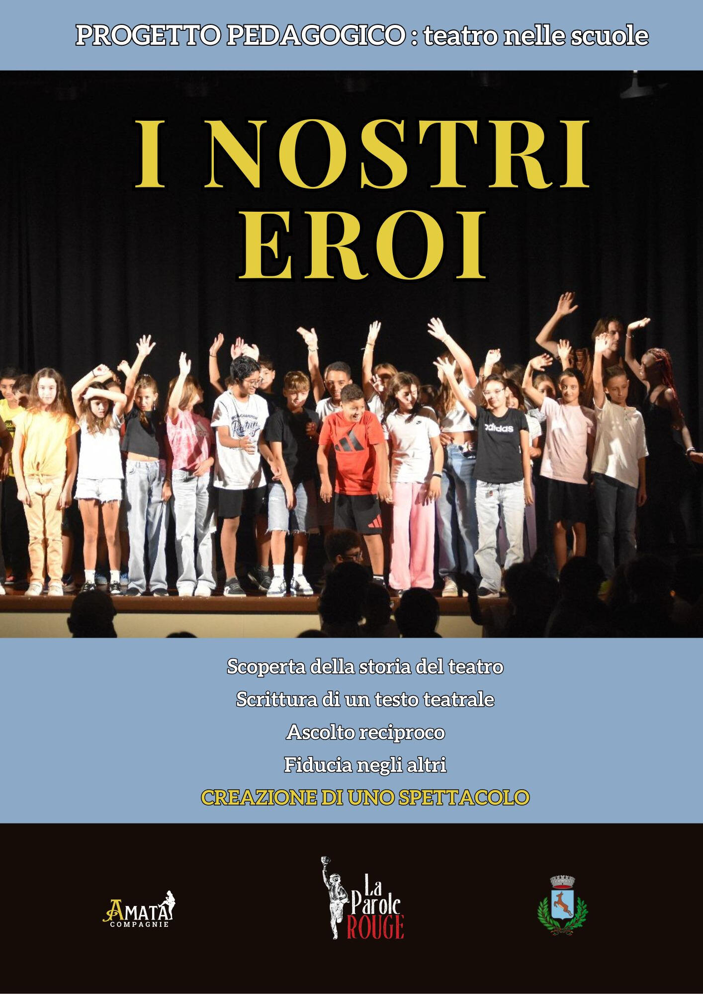 5 giorni di corso per creare un progetto Teatrale. Scoperta della storia del Teatro, ascolto reciproco, formazione del gruppo classe e fiducia nell'altro. Il gruppo affronterà in seguito una discussione rispetto ai temi che toccano gli studenti, dibattito di soggetti importanti che impareremo a difendere davanti ad un vero pubblico. Scrittura di un testo e messa in scena di uno spettacolo da presentare alle famiglie, ai compagni, al personale scolastico e aperto alla comunità intera.
